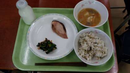 わかめとジャコご飯、ぶりの照り焼き、青菜ののりあえ、呉汁、牛乳