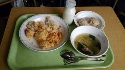 ナシゴレン、珍珠丸子、白菜スープ、牛乳