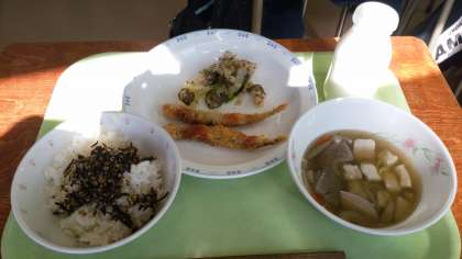 麦ごはん、ひじきふりかけ、ししゃものフライ、野菜のゆかり和え、けんちん汁、牛乳