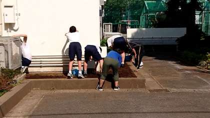 今年も玄関付近にI組の畑の作業がスタートしました。最初は草むしりからです。今年もハツカダイコンにチャレンジです。たくさんの収穫が楽しみですね。