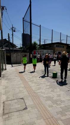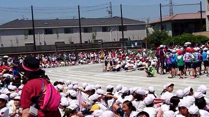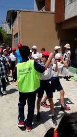 給田小学校の運動会ボランティアでは小学生に霧吹きをして暑さ対策の仕事や短距離走のゴールテープの担当、招集係などの活動をしています。暑い中とても頑張っていますね。