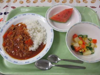 6月24日給食献立 食材・産地 公開日 2019/06/24 更新日 2019/06/24 給食 <献立> ・ハッシュドポークライス ・マセドアンサラダ ・すいか ・牛乳 <主な食材・産地> ・米(秋田) ・豚肉(北海道) ・コーン(北海道) ・じゃがいも(千葉) ・にんじん(千葉) ・たまねぎ(東京) ・きゅうり(埼玉) ・すいか(熊本) いいね(0)