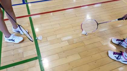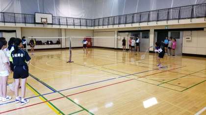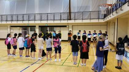 小学生部活動体験では、挨拶から始まり、ショットの説明をしました。その後、実際にラケットを持ってシャトル拾いの練習をしました。簡単そうに見えてなかなか難しい。苦戦してました。