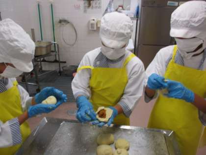 今日は、カレーパンを包んだり、プリン液をカップに注いだりと、