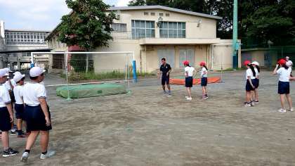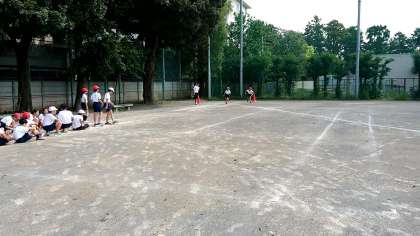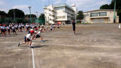 烏山小学校6年生が体験授業で上祖師谷中に来ました。100mのタイム計測、走り高跳びに分かれて活動スタート。暑さにも負けず一生懸命取り組んでいました!