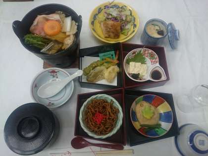 鶏の照焼き、天ぷら盛り合わせ、湯葉造り、焼きそば、炊合せ、茶碗蒸し、寄せ鍋、ご飯