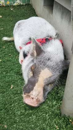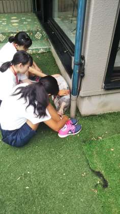 動物病院の仕事を体験中です。休み時間には庭の子豚と遊びました。
