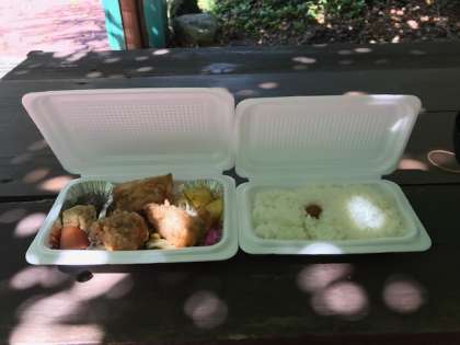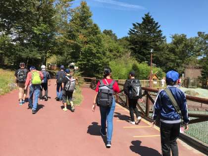 歩いて動物を見て回り、藤棚の下でお弁当を食べています。