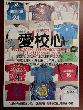 毎月、廊下や教室などに掲示してあるポスター「人格の完成を目指して」、今月は上祖師谷中学校オリジナルポスターでー愛校心ーです。