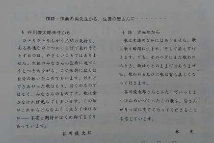 上祖師谷中学校の紹介 公開日 2020/04/08 更新日 2020/04/08 おしらせ 今日の上祖師谷中学校の紹介は校歌です。 本校の校歌は2番までの構成で作詞 谷川俊太郎先生、作曲 林光先生と有名な方によってつくられました。 リズムのよい校歌で覚えやすい歌詞となっています。 毎日、朝の8時にメロディが流れますので楽しみにしてください。 副校長 毛利 いいね(0)