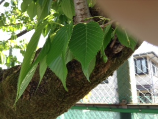ソメイヨシノはソメイヨシノ同士が受粉しても種子が出来ないそうです。違う種類のサクラと受粉しないと実や種子ができません。でも、その種子の子どもはもうソメイヨシノではなく違う種類になってしまうそうです。写真は校庭のサクラの実です(葉の右側)。