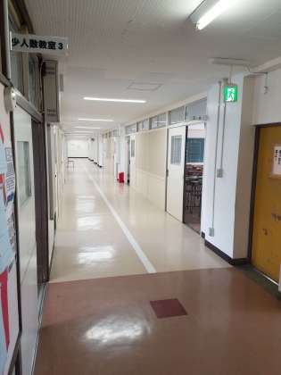 体育館脇に室外機があります。体育館にエアコンが付きました。冬の寒い日、夏の暑い日の保護者会や儀式が快適になります。