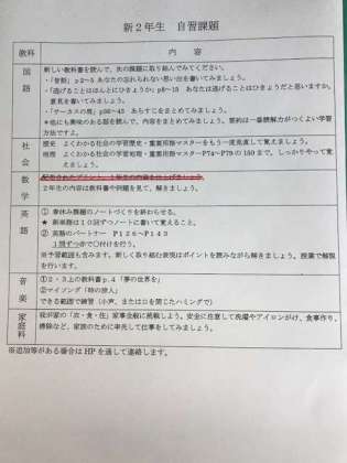 本日、2年生の教科書配布、無事に終了しました。皆さんに渡した青い封筒の中に自習課題一覧表に訂正があります。