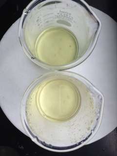 写真の上が真水(中性)、下が雨水です。わかりにくいですが少し黄緑色ですね。ほんの少しですが酸性なんです。