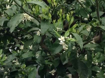 家の近くの畑に低い木があり白い花が咲いていました。