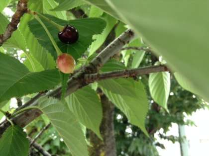 校庭のサクラは果実が熟してきました。中の種子も大きくなってきました。味は少し酸っぱいです(みなさんはたべないように)。もう少し木で熟してもらいましょう。
