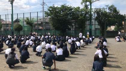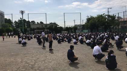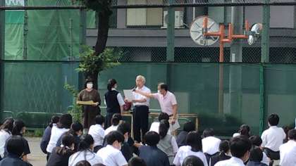 今年度初の全校朝礼は、体育館工事といわゆる「三密」を避けるために校庭で行われました。