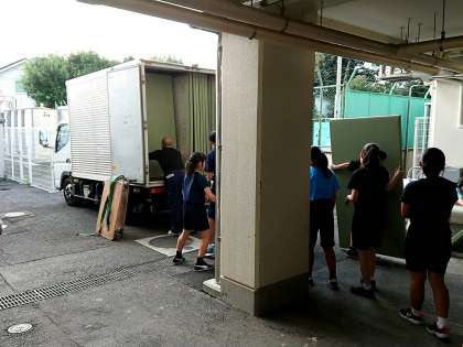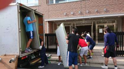 私立豊南高校から体育の授業で使う畳を譲っていただきました。運搬を学校運営委員会や保護者会などで協力をお願いしましたら、(有)大拓さんにトラックを出していただき、荷下ろし、格技室への移動はバドミントン、体力向上、女子バレーボール部の生徒が協力してくれました。