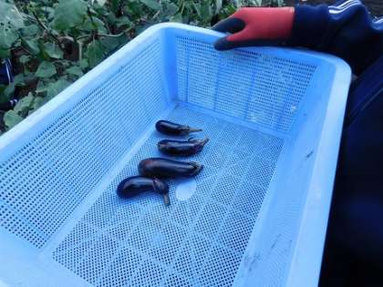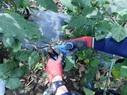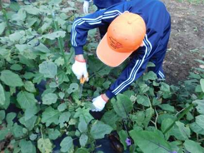 休憩をはさんで、今度はナスの収穫です。