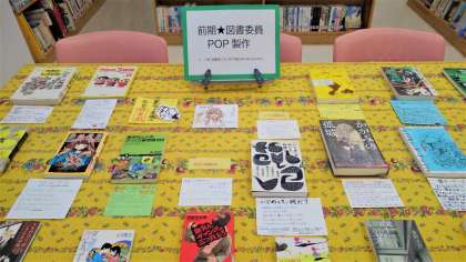 ただいま図書室では、図書委員が作ったPOPを展示しています。