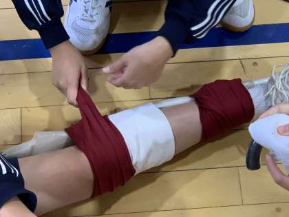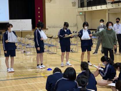 2年生 研究授業 公開日 2020/10/28 更新日 2020/10/28 おしらせ 10月28日、2年AE組女子の保健体育の授業は研究授業でした。烏山小学校の先生方も見に来られる中、怪我の応急手当ての方法を考える授業を行いました。 身近なものを使って、骨折した腕や足を固定するにはどうしたら良いでしょうか?選んだものを使って上手く固定するのに四苦八苦しながらも、これまでに学習した固定法、包帯法を応用してそれぞれのグループで応急手当ての方法を考えていました。 いいね(0)