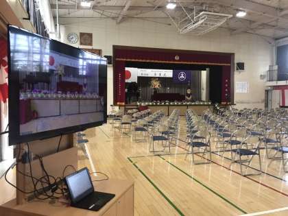 感染症対策を講じながらの式となります。格技室では会場の様子をzoomで中継します。