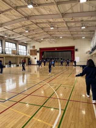 女子は体育館でドッチボールをおこなっています。