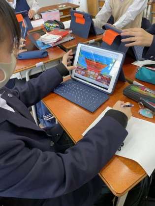 タブレットを使用してそれぞれが分担した寺社仏閣や文化を調べています。
