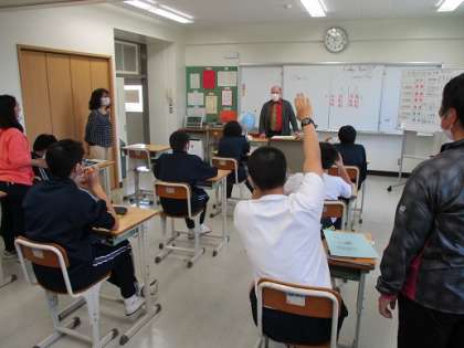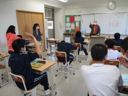 I組 英語 〜ALTの先生が来ました〜 公開日 2021/04/23 更新日 2021/04/23 I組 4月23日(金)の英語の授業に、ALTの先生が来てくださりました。 英語でクイズをしたり、英語での自己紹介の練習をしました。 クイズは2チームで対抗戦をしたのですが、お互い積極的に回答し、大盛り上がり! 結果はなんと、「Draw」でした。 また、一緒に英語の勉強ができるといいですね。 いいね(0)
