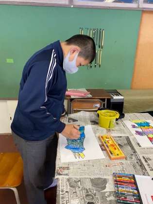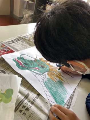 先週に引き続き、共同制作を行いました。それぞれのアイディア、デザイン、想いの詰まった胴体の絵がたくさん出来上がり、龍がどんどん長くなってきました。乾かしている絵もあるので実際はもっと長くなります。掲示する日が楽しみです。