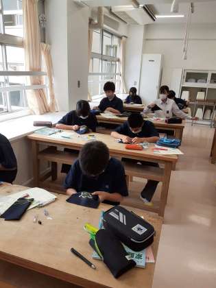 1年生は毎年エプロンを作成しています。今年からポケットの一枚を上中の校章をデザインしています。