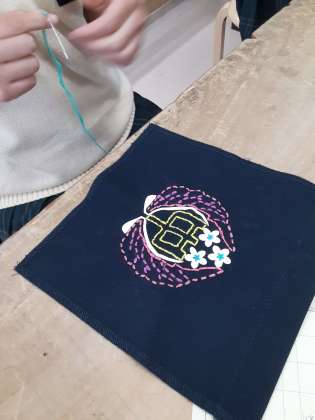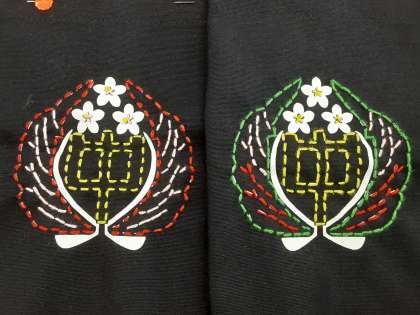中の文字は学年カラーの黄色。周りの配色は個性に合わせて考えています。今日は白いサンザシの花の中心の刺し子を説明しました。