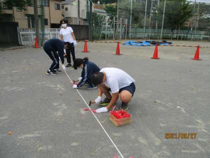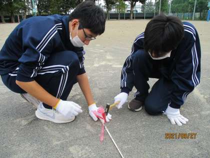 「校庭のポイント打ち」では、実際に設計図に合わせてメジャーで長さを測り、釘を打ち込むという作業を行いました。今回打ち込んだポイントをもとに体育祭当日のレーンが作られるので、正確さが求められる作業でした。それぞれの得意な力を活かし、協力して作業を進めました。無事に終わった時は大きな達成感がありました。当日の体育祭がますます楽しみになりました。
