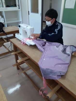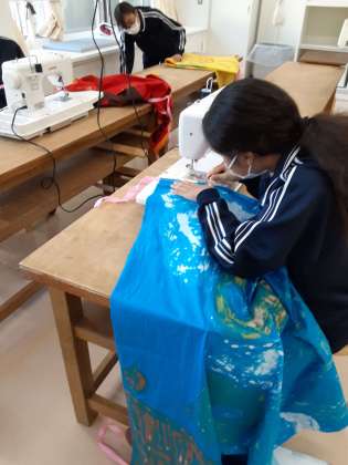被服室ではクラス旗にリボンを縫い着けています。