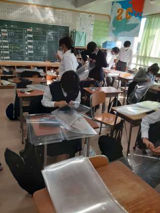 後期になり、給食等に使っているパーティションのマジックテープを新しくしています。