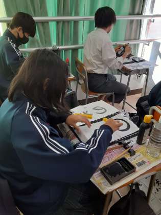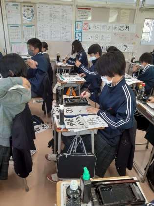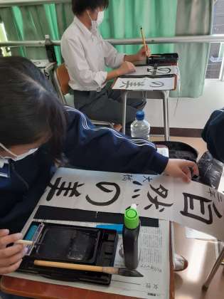 書き初めの課題の、自然の美を書いています。楷書のポイントをつかんでいます。