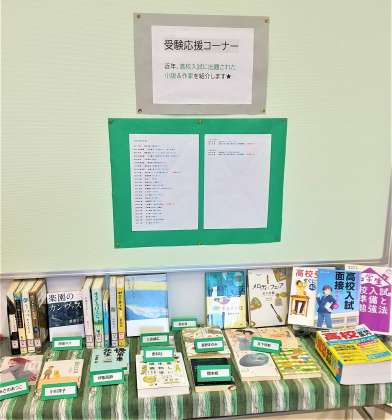 図書室通信 〜受験応援コーナー〜 公開日 2021/12/15 更新日 2021/12/15 おしらせ いよいよ受験シーズンになりました。受験を控える3年生に図書室も何かできるこ とがないかと思い、「受験応援コーナー」を設置することにしました。 これまでに都立入試で実際に取り上げられた本や作家などを紹介しています。その 他、面接や小論文の対策本も置いてあります。 3年生だけではなく、1〜2年生も是非手に取ってもらえたら嬉しいです。 図書室 いいね(0)