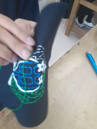 まずはポケットのししゅうです。上祖師谷中の校章を本返し縫いで縫い上げます。