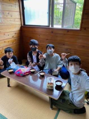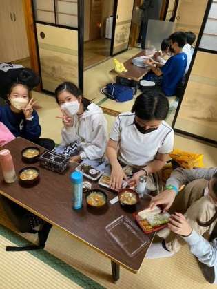 奥庭荘でけんちん汁をいただきながら昼食をいただいています。