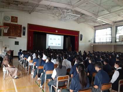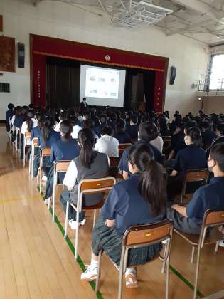 道徳地区公開講座 公開日 2022/07/09 更新日 2022/07/09 おしらせ パナソニックの公演会です。企業としての理念、創業者の松下幸之助から学ぶことができました。 2-3年生と保護者、地域の方は体育館で、1年生はズームで参加しています。 いいね(0)