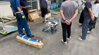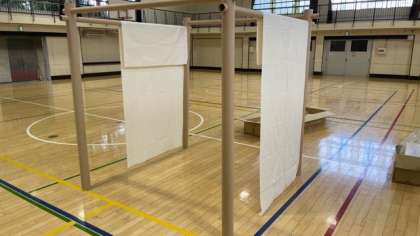 避難所運営訓練勉強会では体育館や校庭にて避難所訓練に関わる用具等を設置しています。実際に来週の10日には本校1年生がこれらの用具を実際に設置します。いずれ来ると言われている震災に備えて防災教育を今後とも進めて参ります。