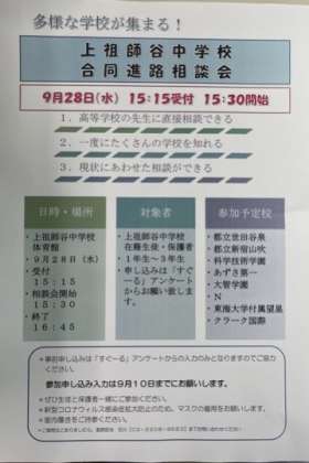 以前にすぐーるでも連絡させていただきましたが9月28日水曜日に上祖師谷中学校合同進路説明会を行います。