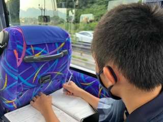 バス車内で、今日の振り返りをしています。