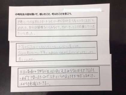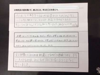 一時間目の講演を聞いて、帰りの学活で振り返りを行いました。