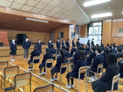 【2学年】学年集会 公開日 2022/12/22 更新日 2022/12/22 おしらせ 12月21日(水)の5時間目に、学年集会を行いました。各クラスの学年委員が、2学期の振り返りを発表しました。生徒主体で進め、3学期を迎える心構えについて考える事ができました。 いいね(0)