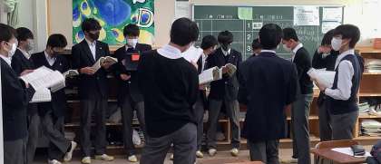【2学年】音楽祭練習 公開日 2023/02/17 更新日 2023/02/17 おしらせ 合唱をする上で、一つ一つの歌詞にどんな思いが込められているのか皆で意見交換をしています。各クラス様々な工夫をしながら練習しています。 いいね(0)