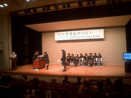第24回 中学生のつどい ① 公開日 2012/02/05 更新日 2012/02/05 おしらせ 2月5日烏山区民会館ホールにて中学生のつどいが行われました。中学生の主張大会には6名の生徒が学校の代表として参加し、清々しい主張をしてくれました。 いいね(0)