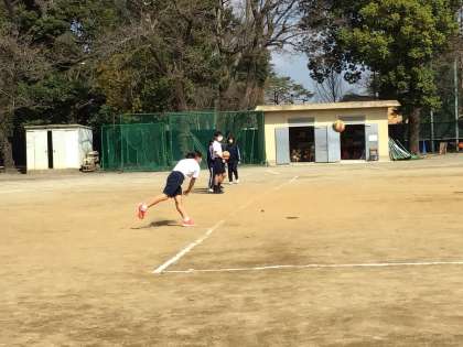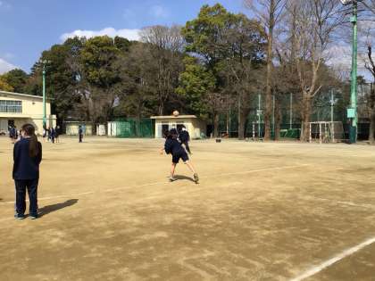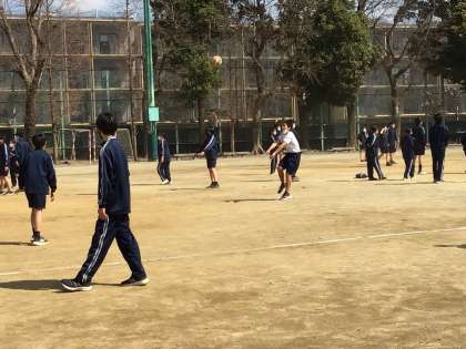 校庭では、男女間混合ドッチボール大会をしています。15VS15 男子は利き手で投げるの禁止、5分前になると、ボールが2つになるというルールで行っています。
