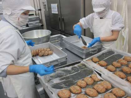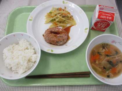 鶏ごぼうバーグは、鶏ひき肉にごぼうと大豆、豆腐、鶏砂肝を混ぜ合わせて焼いた、栄養たっぷりのハンバーグです。残食はゼロで、とてもよく食べていました。