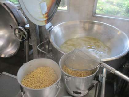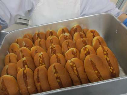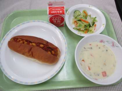 チリコンカンドッグは、乾燥大豆を戻してチリパウダーで味付けしたミートソースとあわせてパンに挟みオーブンで焼いてつくりました。どの学年もよく食べていました。
